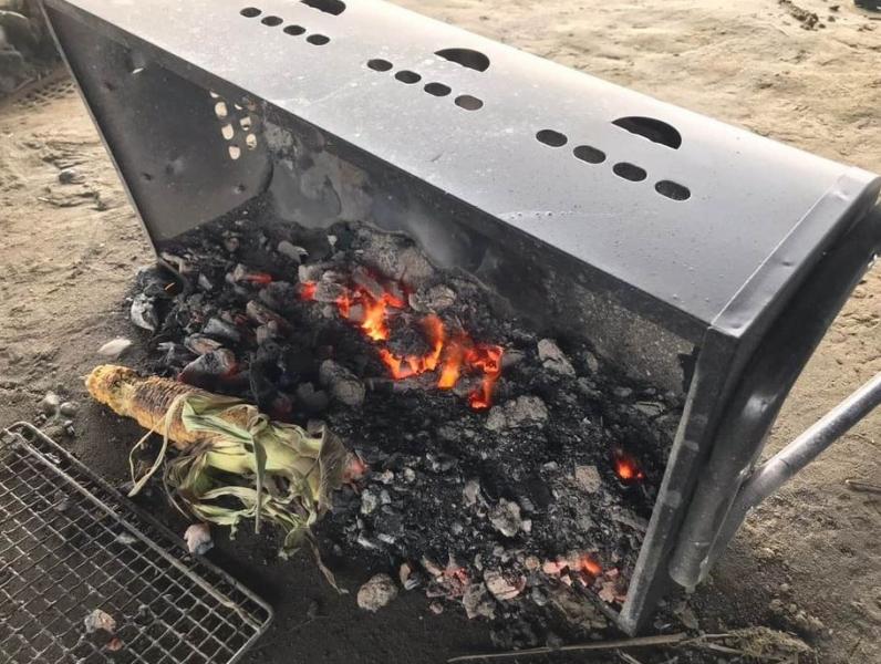 コンロは横倒しになって煙が出ており、別の写真では、火が点いた炭が赤々と燃えている様子が写っていた。