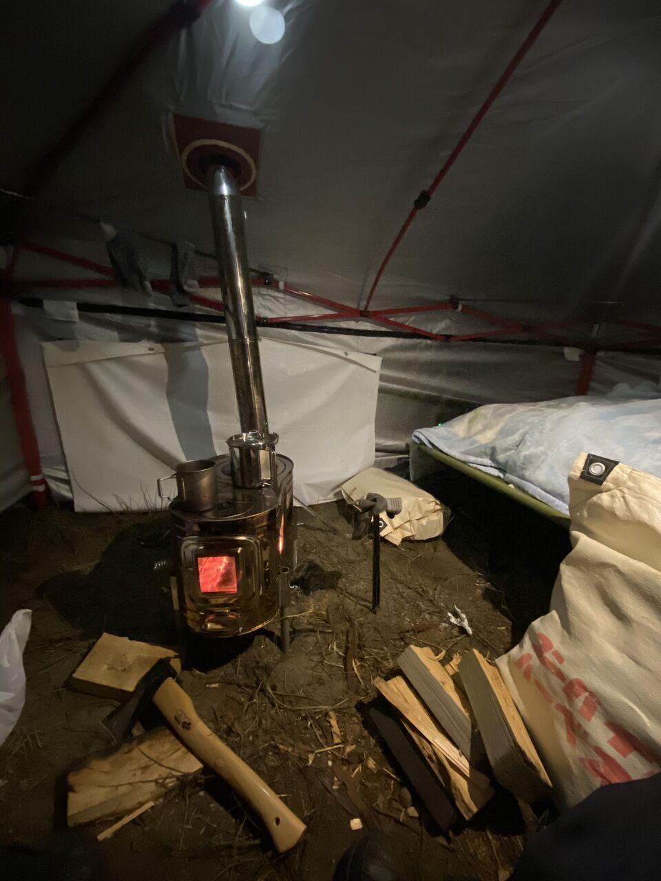 冬場のキャンプに薪ストーブは必須やし難燃性のテントも欲しいところや
